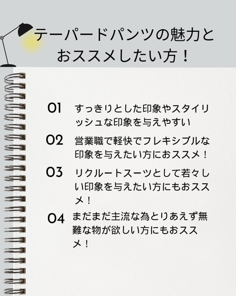 リクルートスーツにも若々しい印象を与えやすいテーパードがおすすめです。