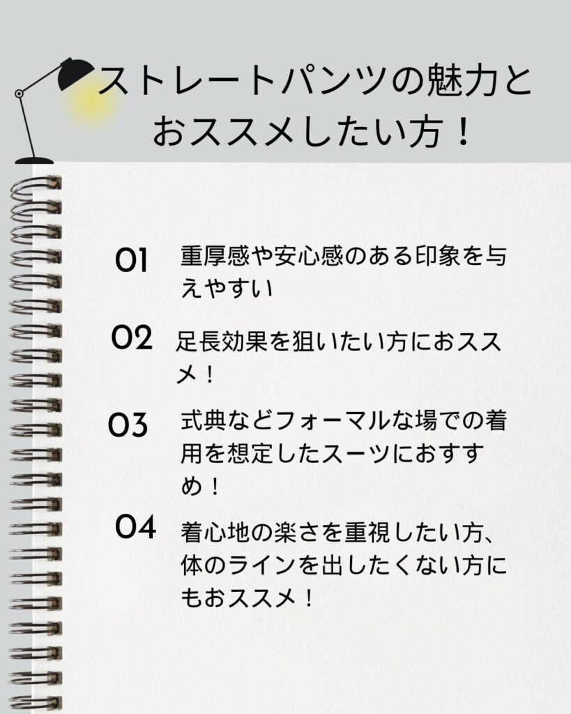 また、テーパードに対してゆとりを取りやすい為、着心地の楽さを求めたい方や下半身のラインを拾いたくない方にもおすすめです。
