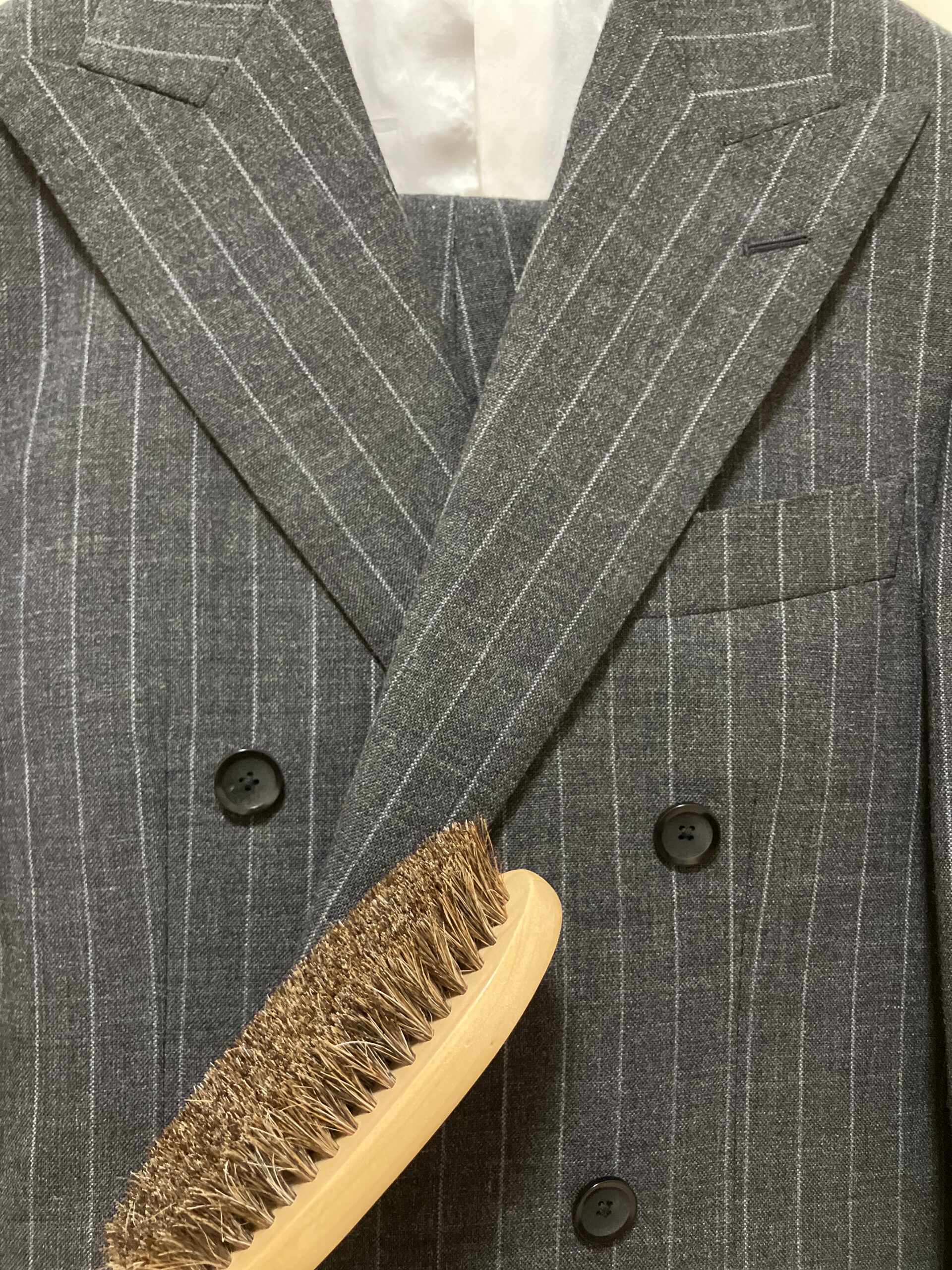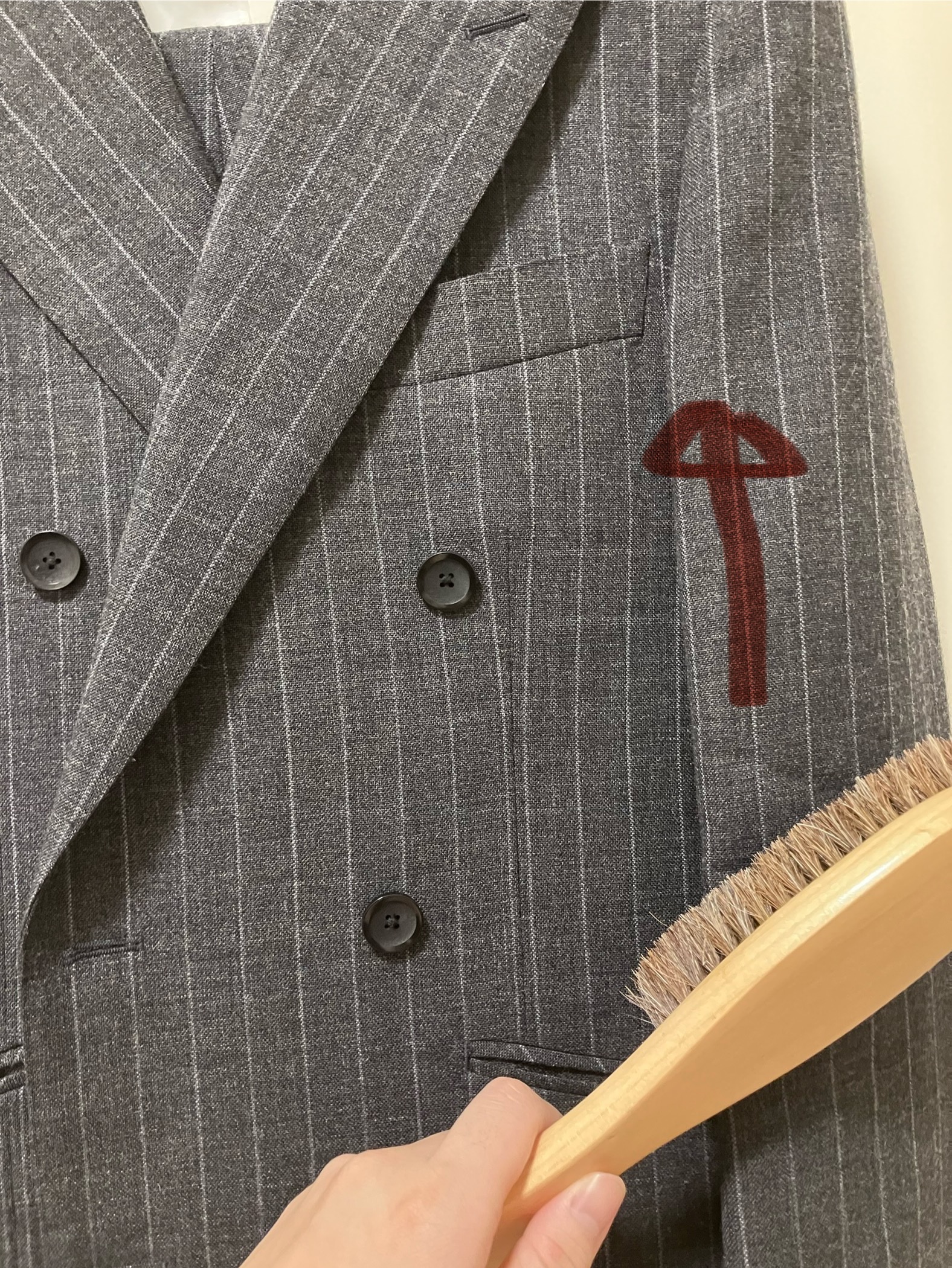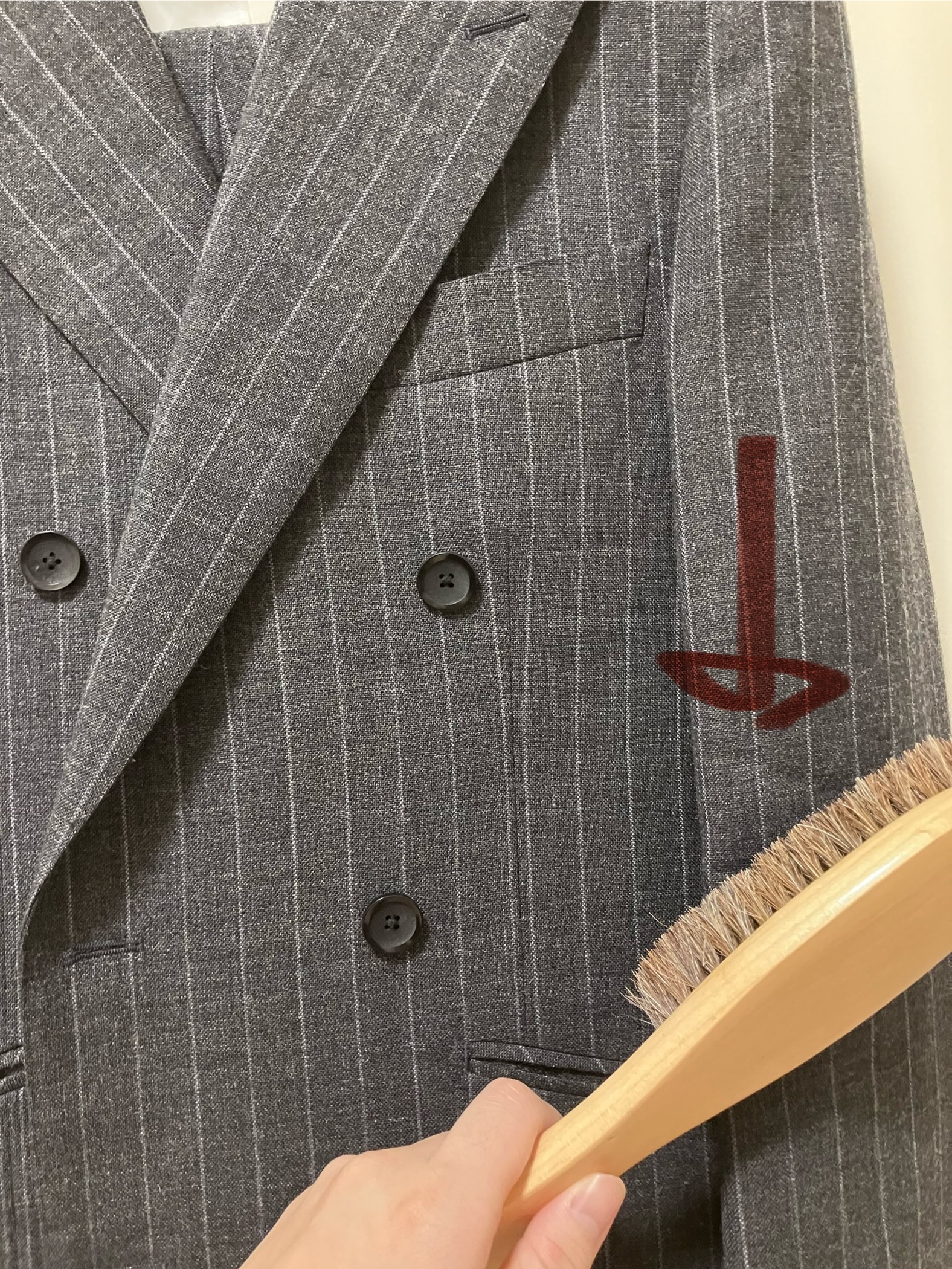 手順②:ブラシを使い、下から上にスーツの生地の繊維を立て、ほこりを掻き出すイメージでブラシを充てていきましょう。手首のスナップを効かせながら丁寧に行ってください。