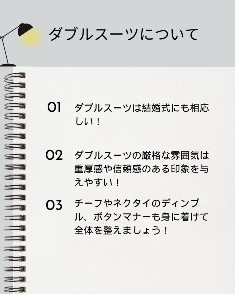 ダブルスーツはその堂々としたシルエットから信頼感も与えやすいです。