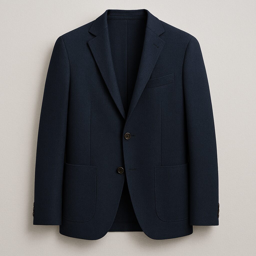 ✅ ジャケット:ダークネイビーの無地、肩パットなしで軽い印象