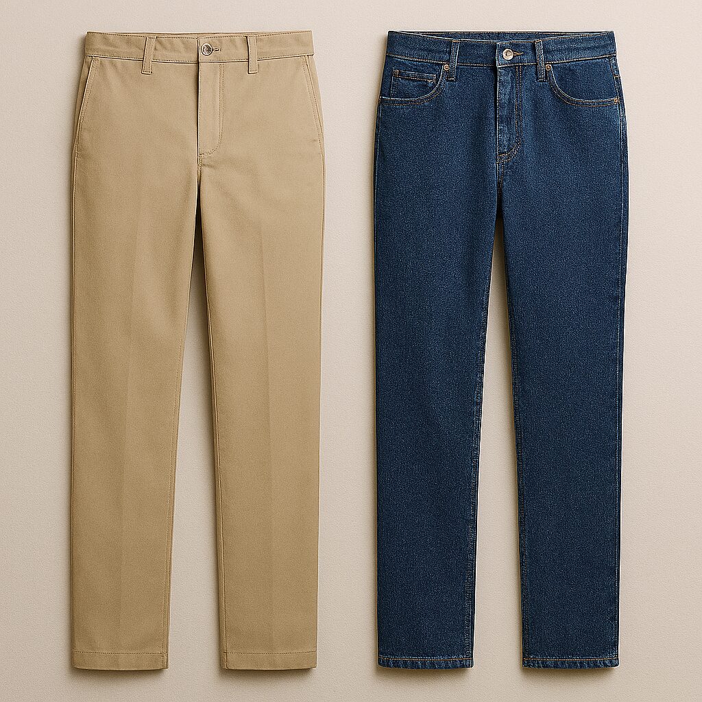 *ベージュのスラックスとデニムのイメージです。休日用にカジュアル感を出したい場合には試していただきたいです。この二つはお持ちの方も多いと思います。