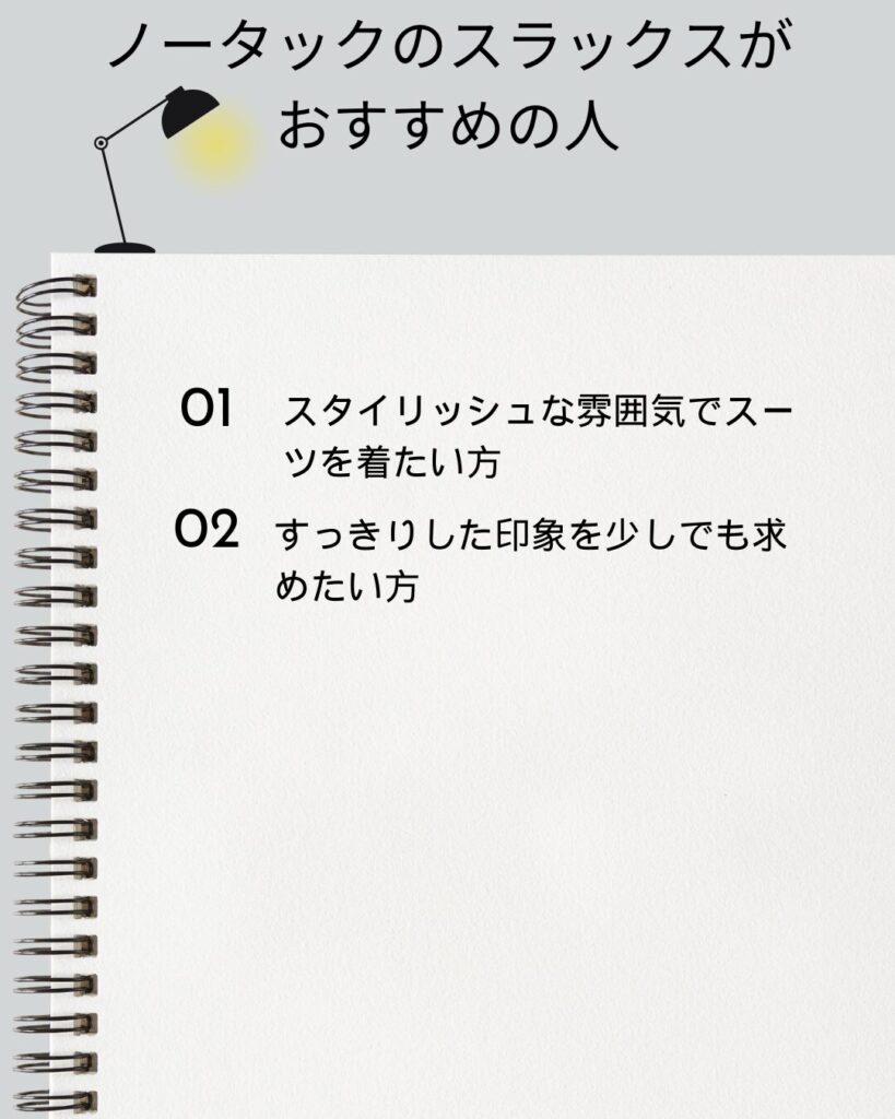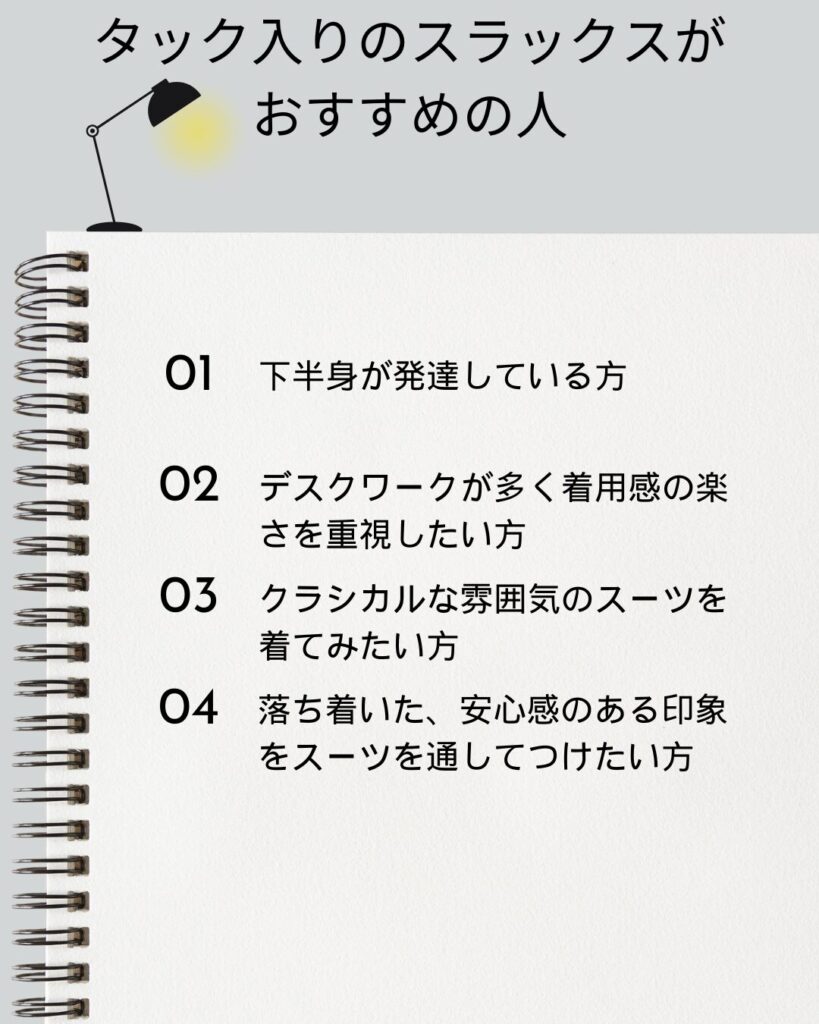 もしスーツに対してスタイリッシュな雰囲気を少しでも求めたい場合は、スラックスにタックがあると違和感を感じるかもしれません。