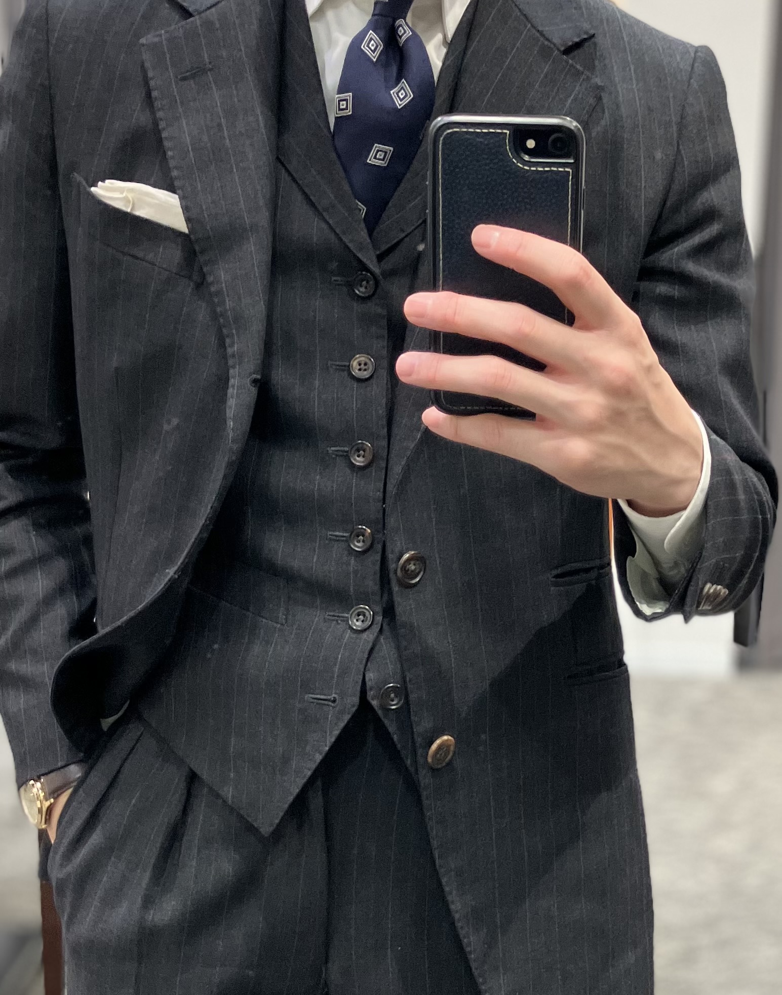 スラックスにタックがある事によって、クラシカルで余裕のある雰囲気を表現出来ます。
