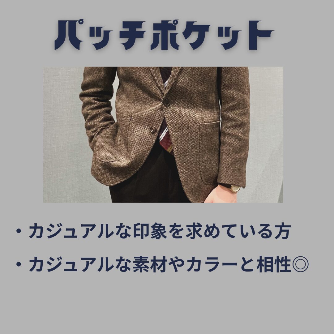 普段あまり意識されない部分ですが、種類や形によってフォーマルさやカジュアルさ、さらにはスタイルの見え方まで変わってきます。今回は代表的なジャケットのポケットの種類についてご紹介します。