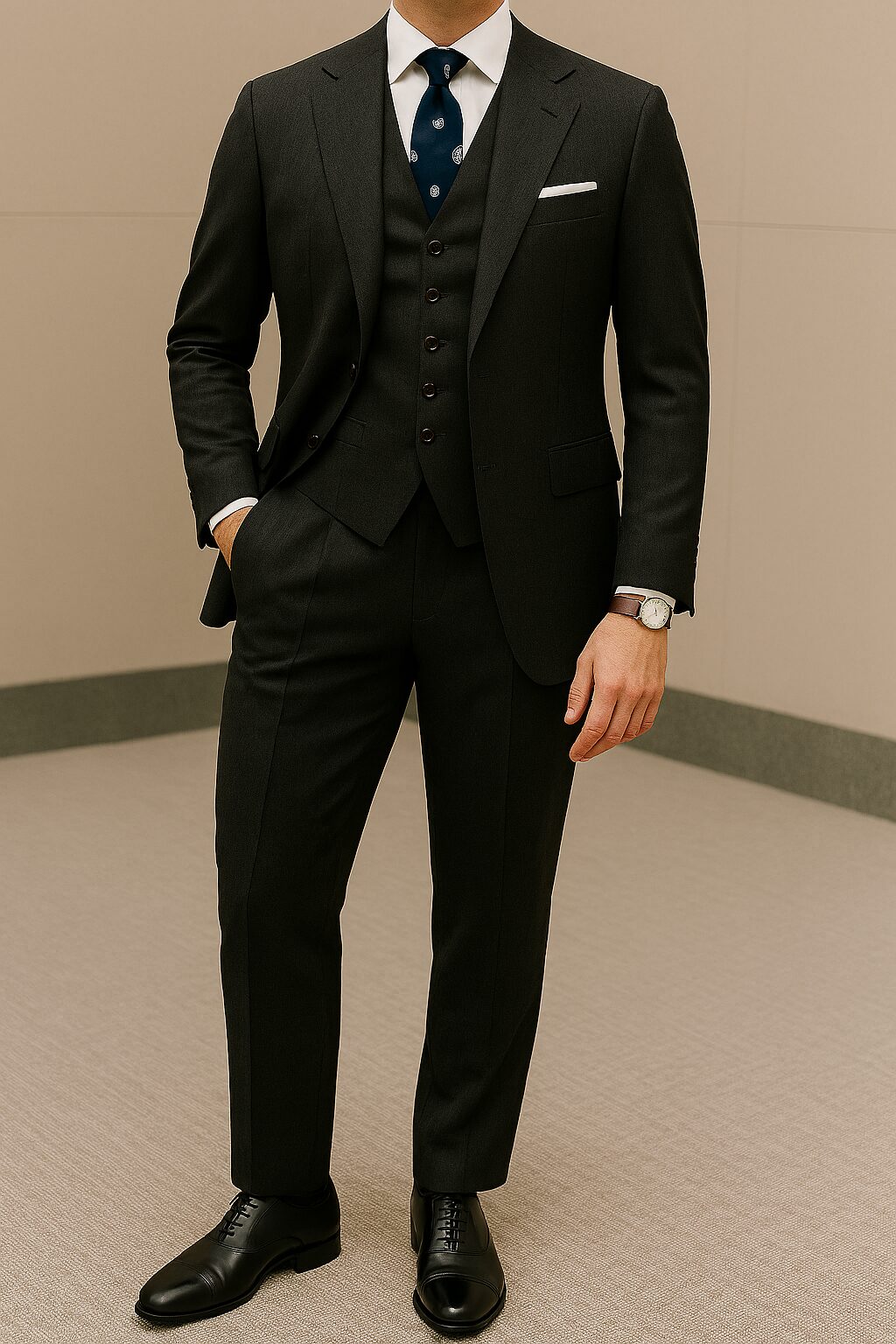 *シンプルなスーツの参考画像です。派手さはなくても、細部にこだわることで“きちんと感”が際立ちます。このあと、画像のように差がつく着こなしのポイントをご紹介します。